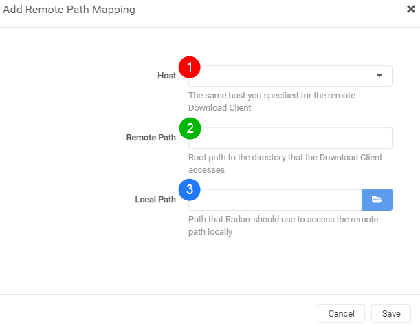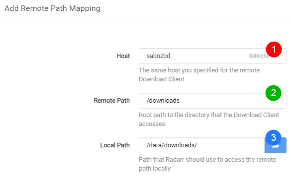 Host=> This is the hostname or IP you set in your download client settings.Remote Path=> The download path that you've set in your download client.Local Path=> The path Radarr needs to access the same path.