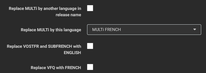 Prowlarr allows MULTi to be replaced by another language. This option is great in theory but will lead to false positives regarding the French audio CFs. Please prefer using the Sonarr-specific settings "Indexers - Multi Languages option" below.